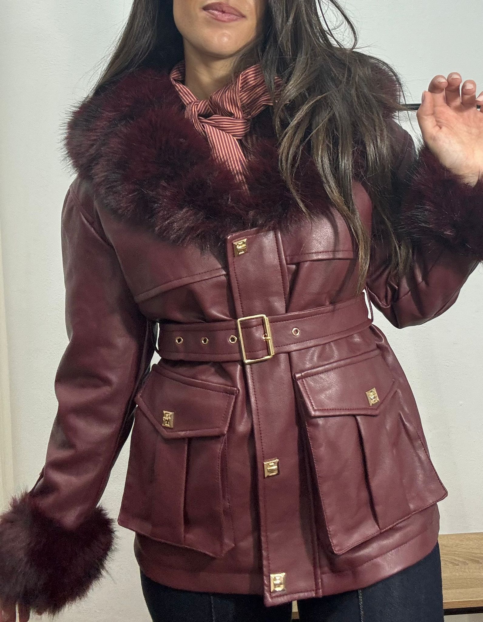 Chaqueta de piel sintética en tono burdeos con cuello y puños al tono. Diseño entallado con cinturón y hebilla dorada. Interior de pelito, ideal para el frío.