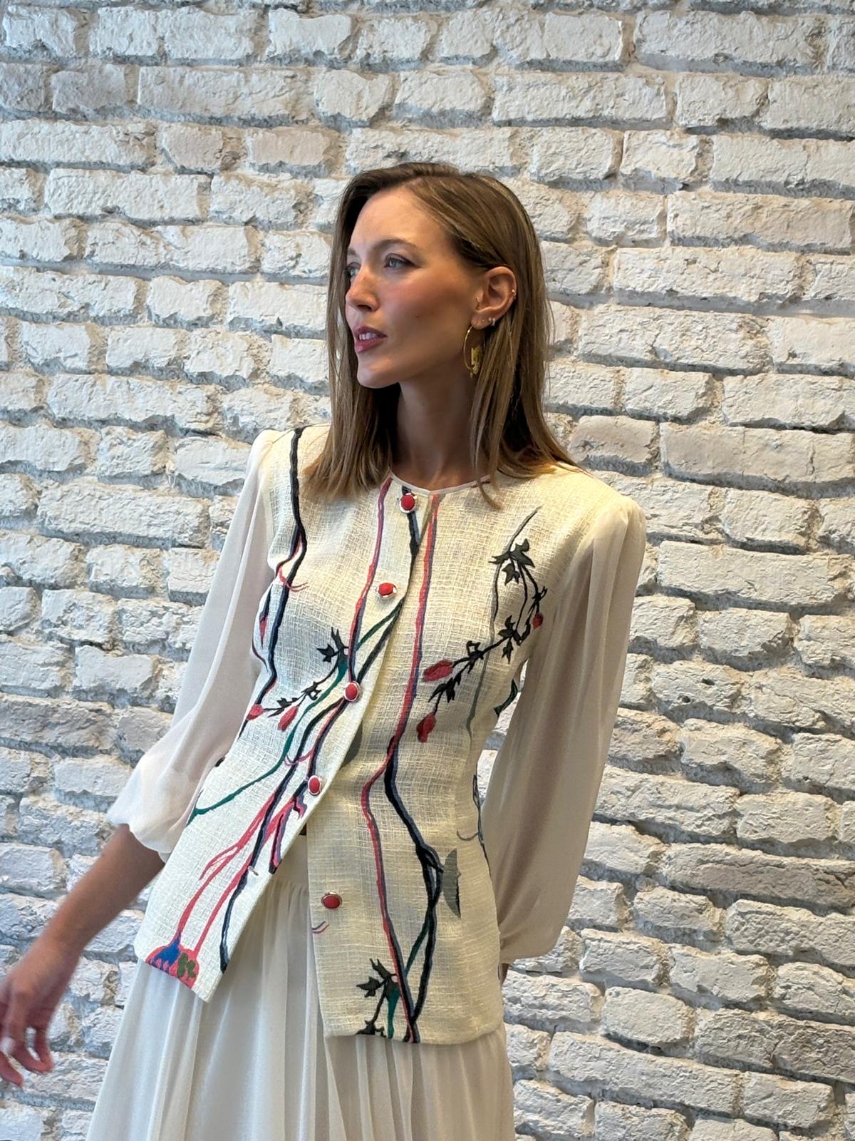 La chaqueta, de corte recto y ligeramente entallado, está confeccionada en un tejido tipo tweed en tono marfil. Destaca por su delicado bordado floral en contraste, con líneas orgánicas en negro, verde y rojo que estilizan la silueta. El diseño se completa con botones decorativos en rojo y mangas semitransparentes que aportan ligereza y elegancia.
