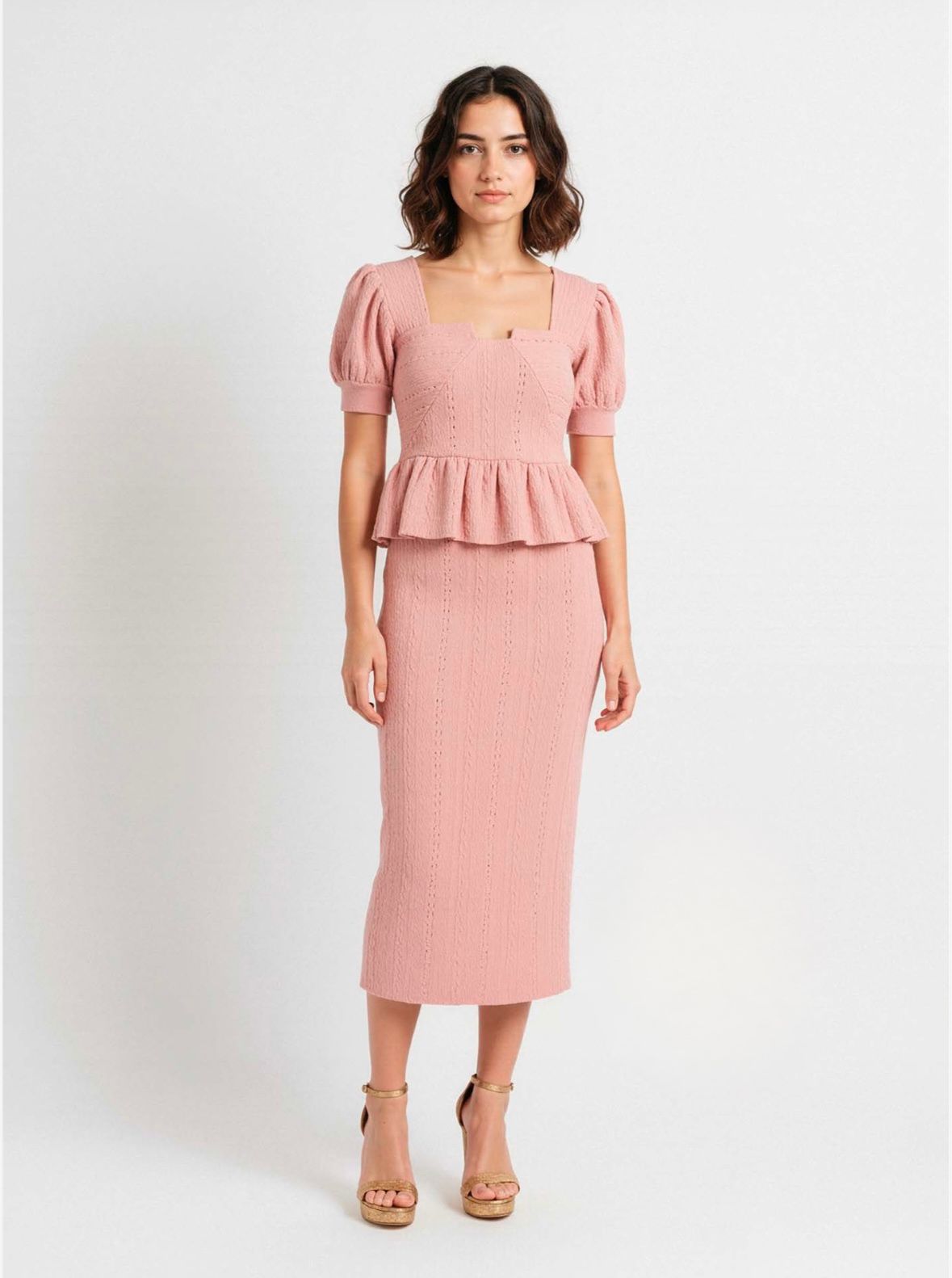 Presenta un escote cuadrado que realza el cuello y el escote con discreción, acompañado de mangas cortas ligeramente abullonadas que aportan un aire romántico y equilibran la figura. El detalle de volante en la cintura define la silueta y añade movimiento, mientras que la falda de corte recto y largo midi estiliza y alarga visualmente la figura.