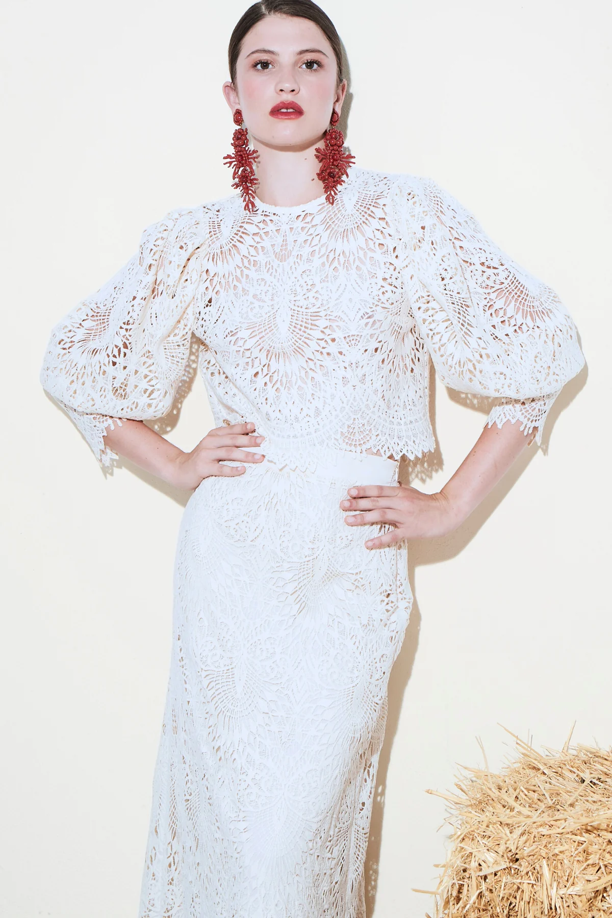 Este sofisticado conjunto de encaje blanco es la definición de feminidad y distinción. Confeccionado en un delicado encaje de diseño floral, combina textura y ligereza para un look refinado y moderno.