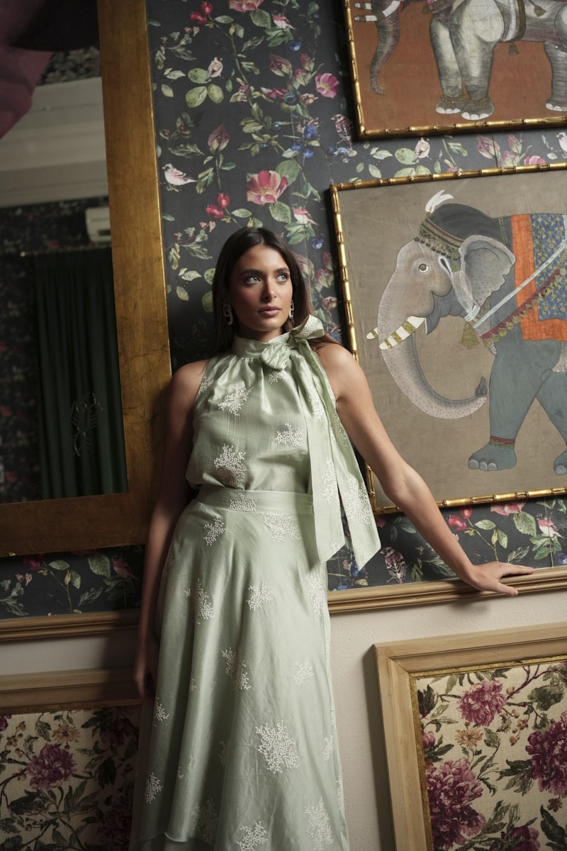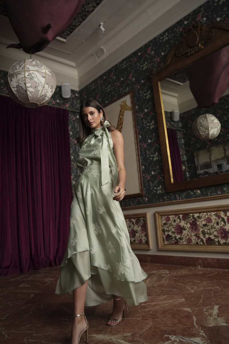 El Conjunto Taylor está confeccionado en voile bordado, un tejido ligero y sofisticado que aporta delicadeza al diseño. La falda de doble vuelo con bajo desigual añade movimiento y elegancia, mientras que el top sin mangas incorpora un delicado detalle de lazada, ofreciendo un acabado femenino y versátil.