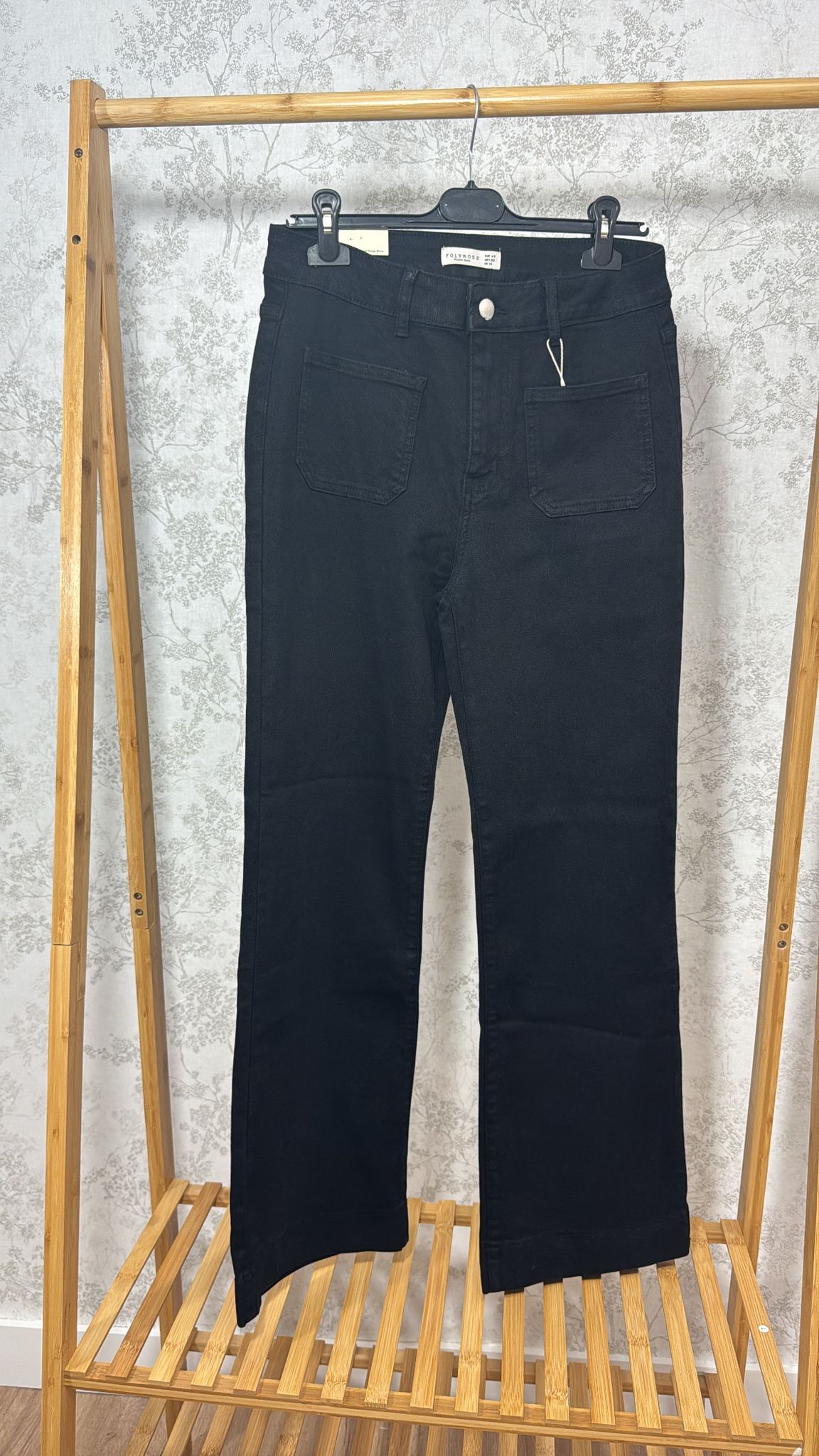 Jean negro de tiro alto, confeccionado en denim resistente y cómodo. Diseño clásico de pierna recta, ideal para looks casuales o más formales. Cuenta con bolsillos delanteros tipo parche, cierre con botón y presillas para cinturón. Color negro intenso, fácil de combinar y perfecto para cualquier temporada.