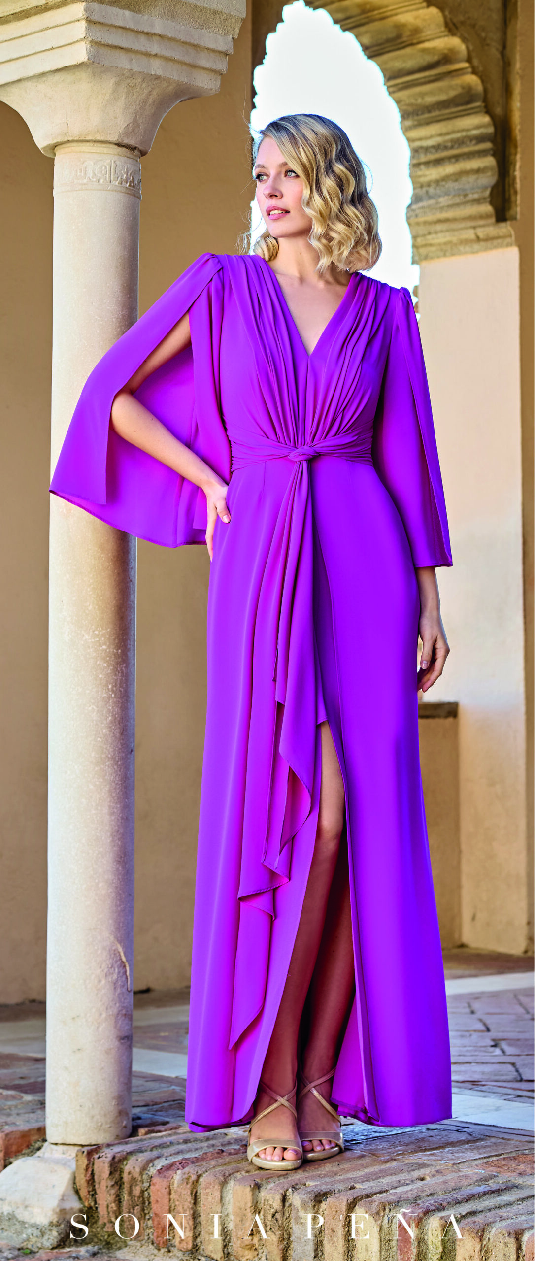 Su escote en pico se complementa con un delicado drapeado central que estiliza el torso y define la cintura con sutileza. Las mangas tipo capa aportan fluidez y un aire etéreo, creando un efecto envolvente y muy elegante al caminar. La abertura frontal añade un toque sensual y moderno, manteniendo el equilibrio perfecto entre sofisticación y atrevimiento.