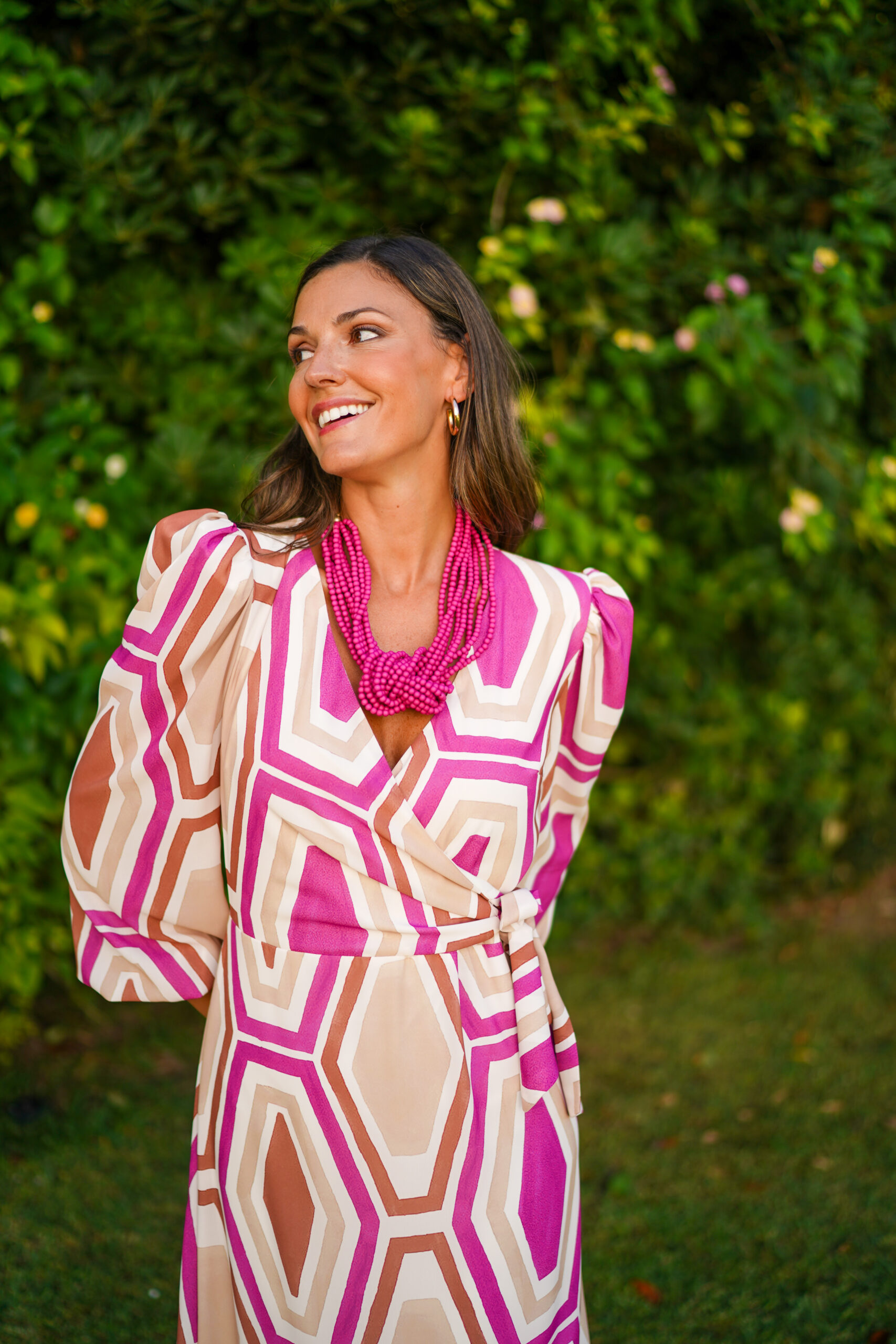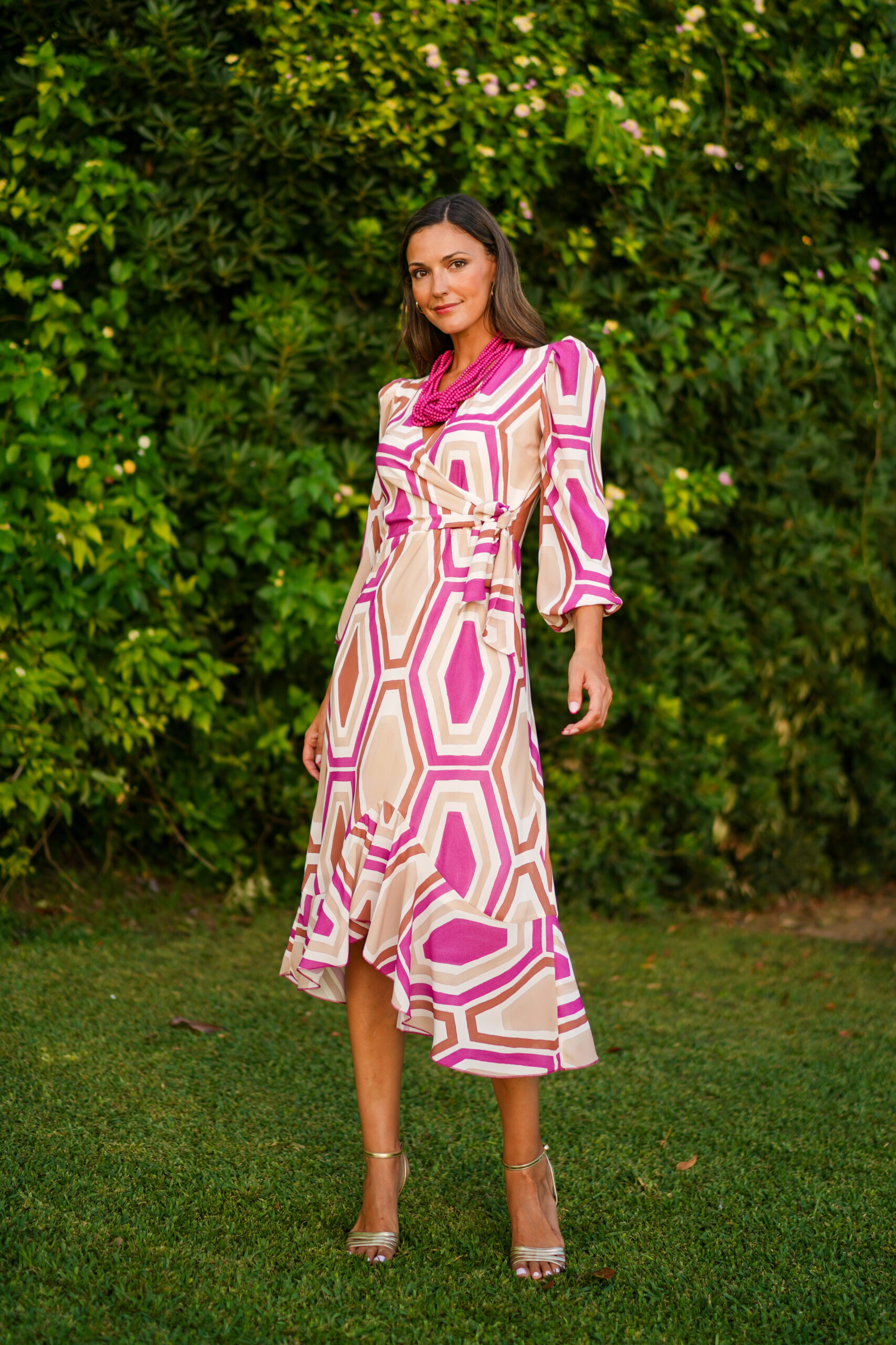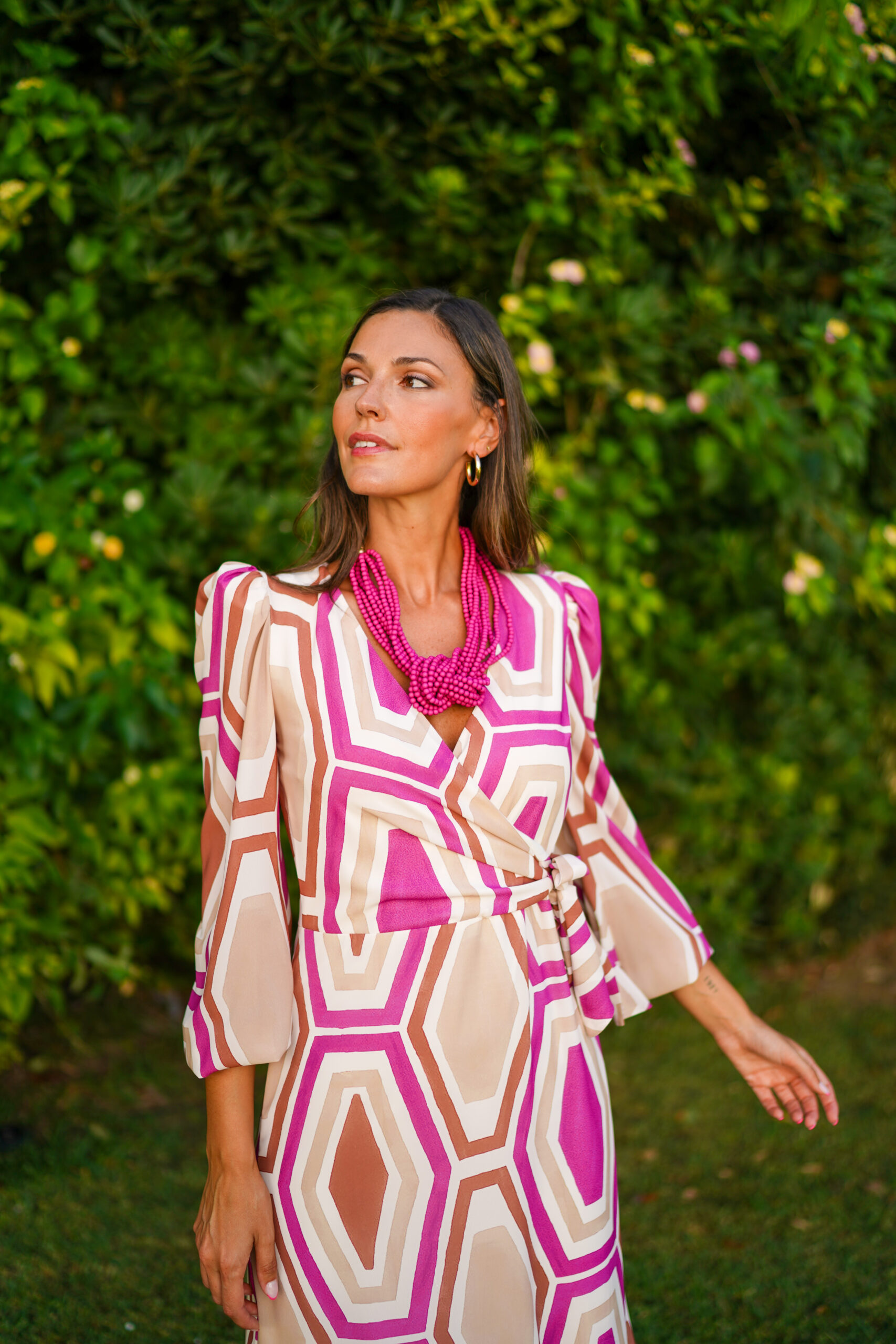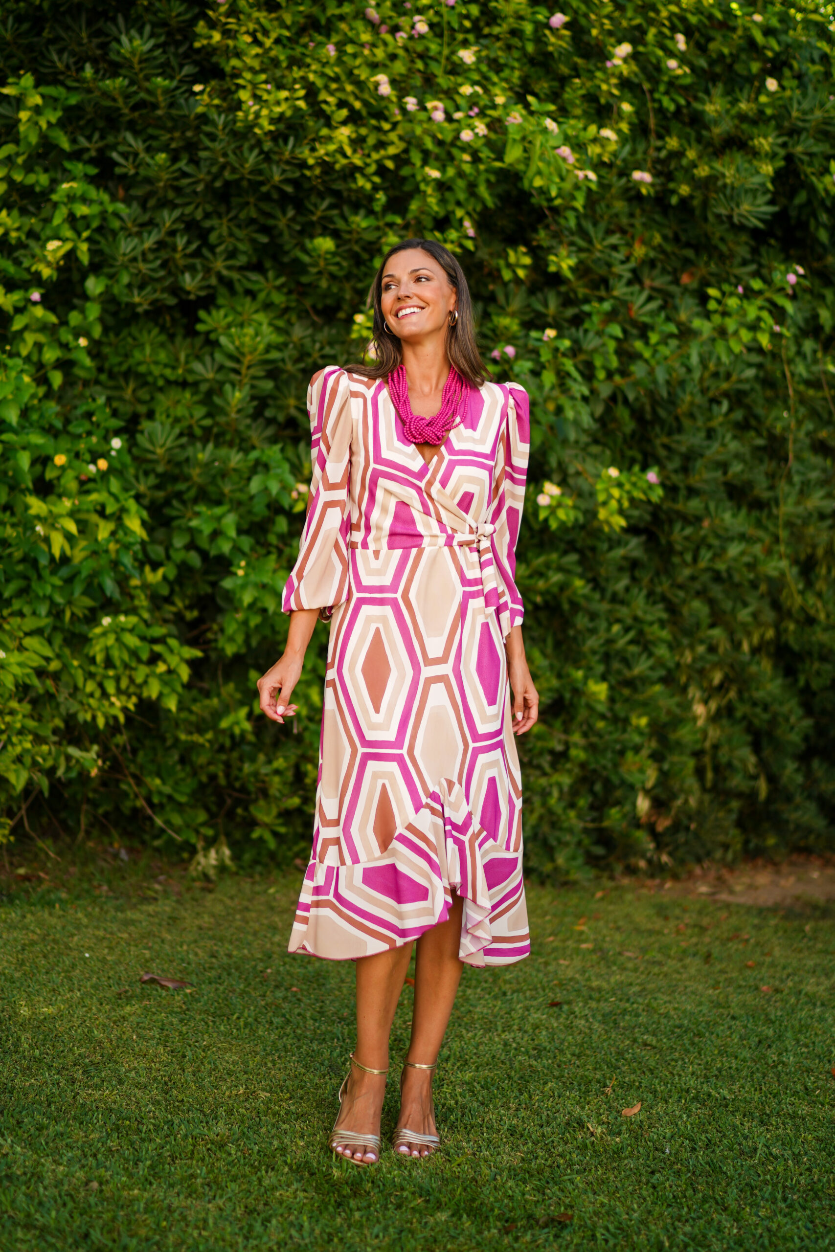 El Vestido Gea Fucsia es una pieza vibrante y sofisticada que destaca por su impactante estampado geométrico en tonos fucsia, nude y tierra, ideal para quienes buscan un look con personalidad y elegancia.