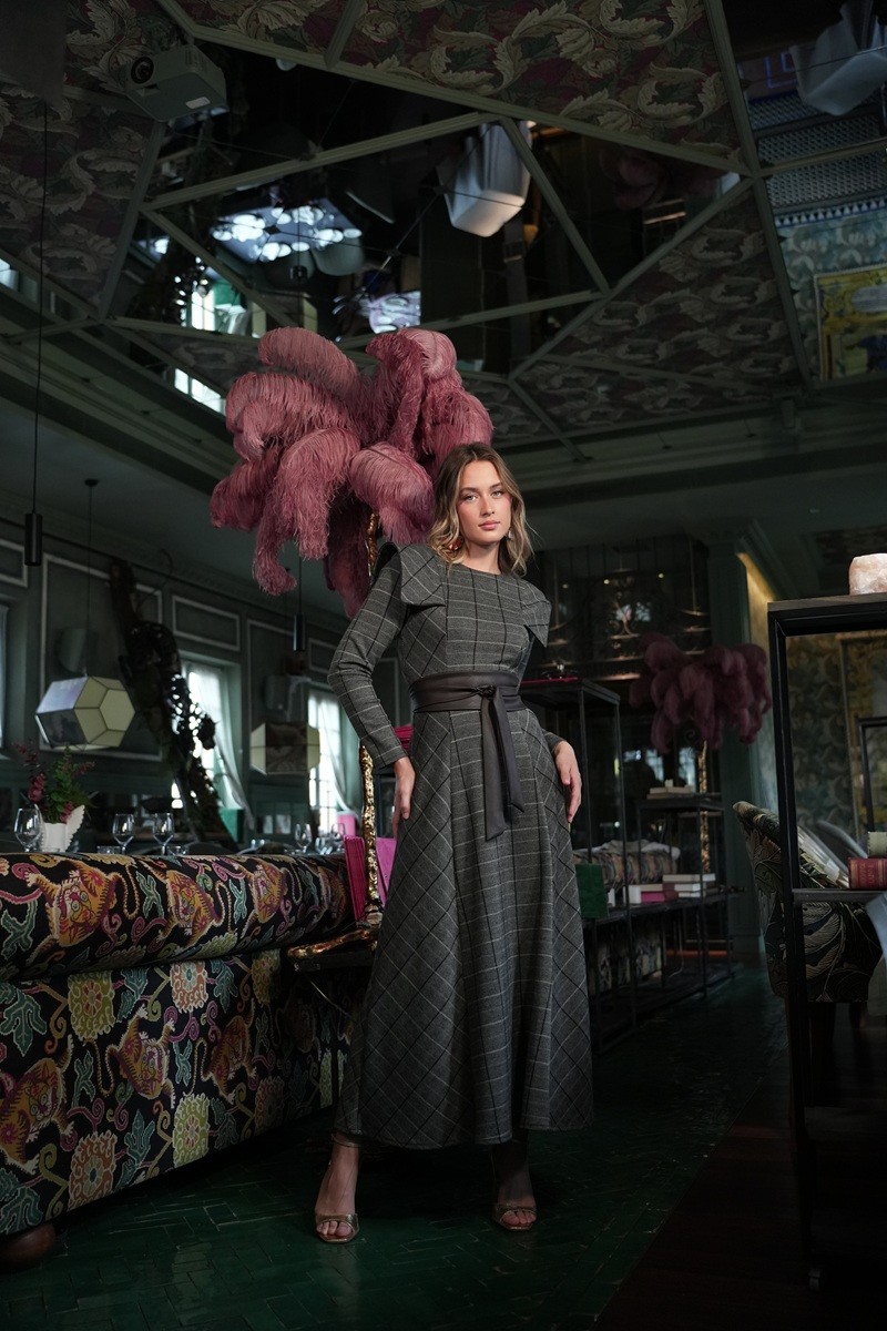 Vestido de invitada midi confeccionado en tejido de punto grueso. Tejido con cuerpo y diseño de cuadros gales, realza la silueta gracias a su fajín de cuero que enmarca la cintura. El original cuello estructurado aporta un toque arquitectónico y distinguido. Cierre de cremallera invisible en espalda.