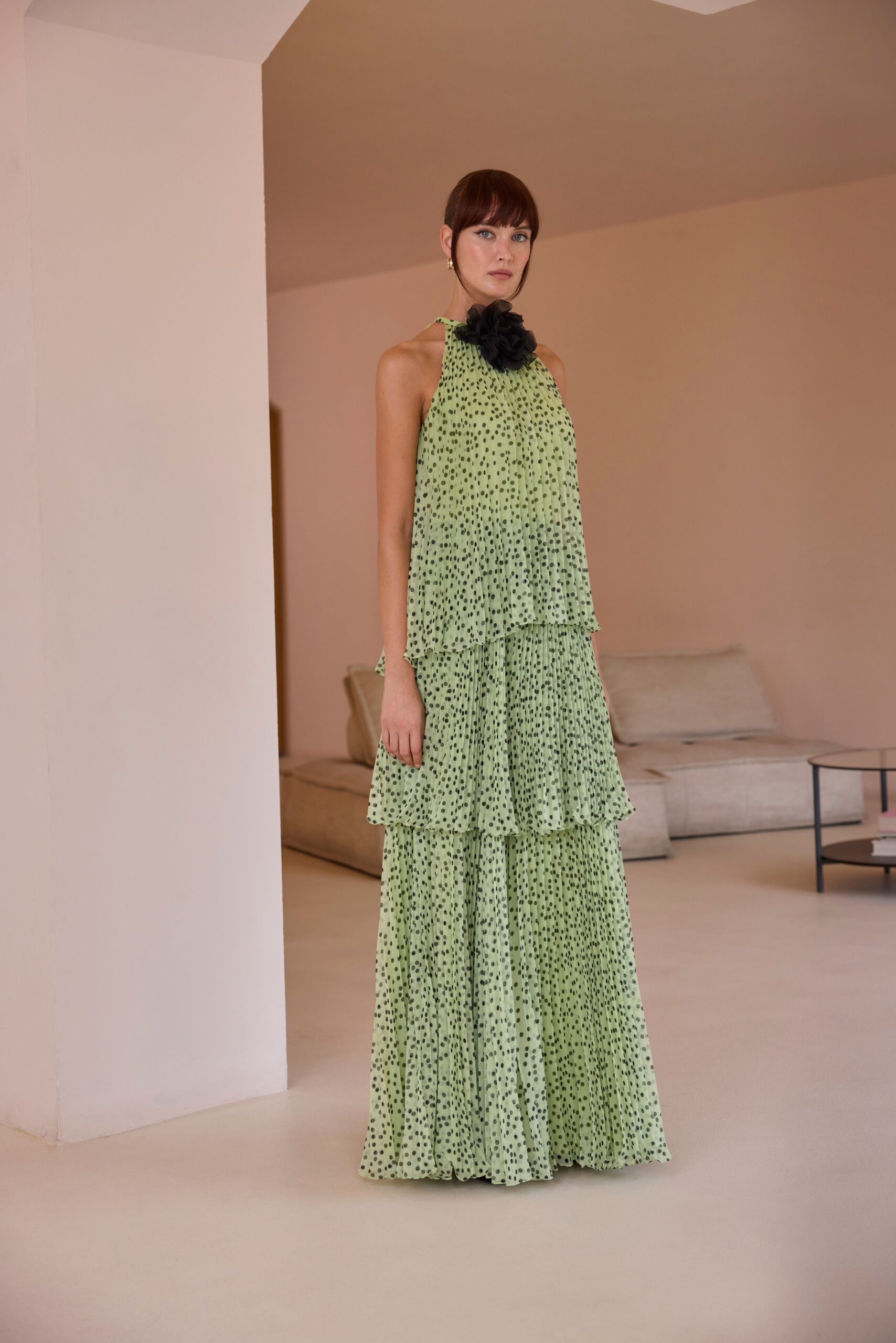 Este vestido largo es una pieza única que combina ligereza, movimiento y sofisticación. Confeccionado en un delicado tejido plisado, destaca por su estampado de lunares sobre un suave tono verde que aporta frescura y elegancia a partes iguales.